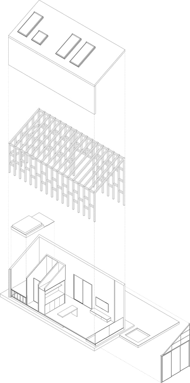 O sistema que comanda a casa fica em uma pequena área na parte de trás da cabine. Dentro do espaço fica o sistema de captação de chuva, aquecimento de água e os equipamentos de plumbing. A casa é gerida por três compartimentos diferentes que constituem o 'esgoto': o tanque de água doce, o tanque de águas cinzas e a energia é fornecida por painéis solares.