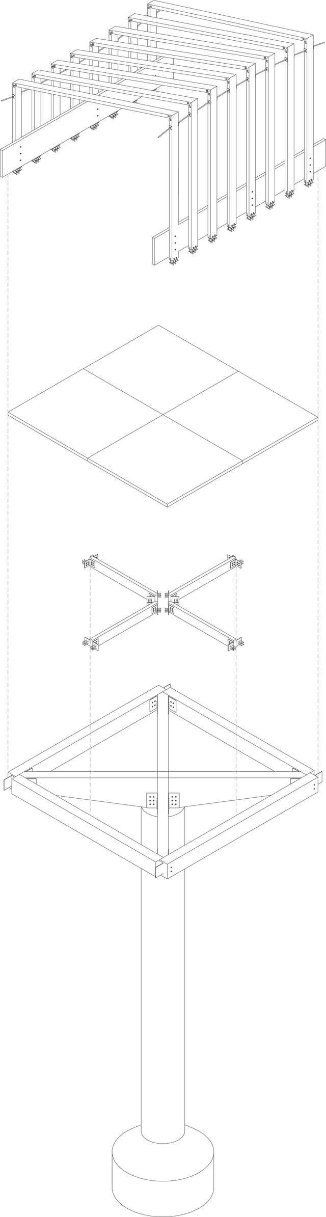 Para sua formação, foi utilizada a madeira laminada colada (MLC), que é um material estrutural fabricado através da união de segmentos individuais de madeira colados com adesivos industriais, e o concreto para o pilar de fundação de 1.20m x 2.80m de diâmetro. Por fim, para todas as conexões, foram utilizadas peças metálicas, desde chapas de 8mm de espessura até cabos de aço para a fixação dos pórticos entre si.